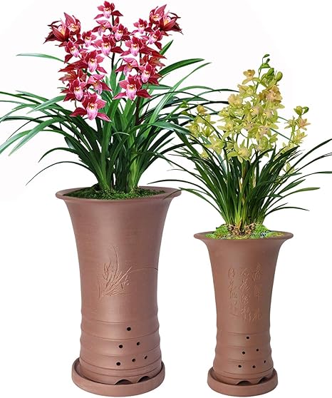 Amazon Com Dahlia 6 X 9 5 H Floral Chinese Cylindrical Zisha Bonsai Pot Flower Pot W Saucer Set Of 2 Brown Home Kitchen